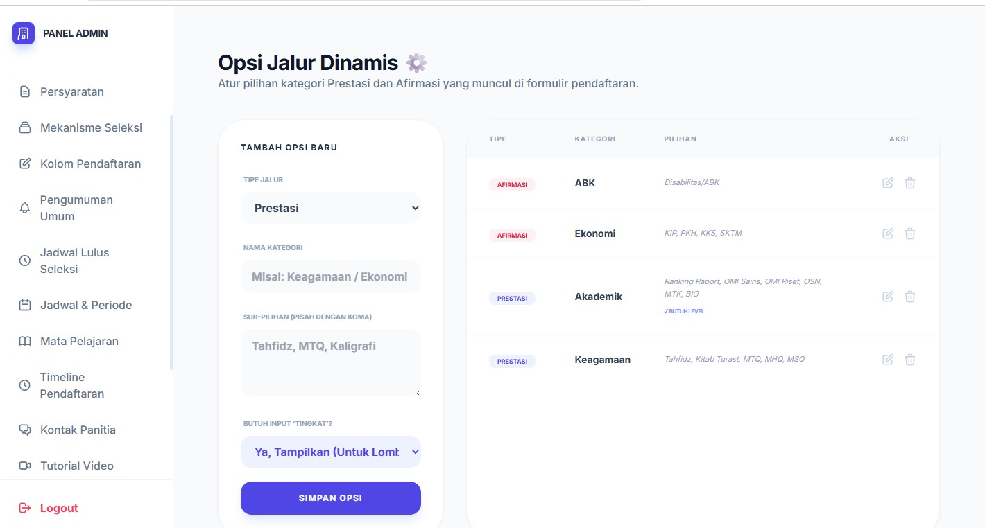 Dynamic Enrollment Path: Atur pembukaan jalur pendaftaran (Prestasi, Afirmasi, Reguler) dengan periode waktu yang berbeda-beda secara otomatis.