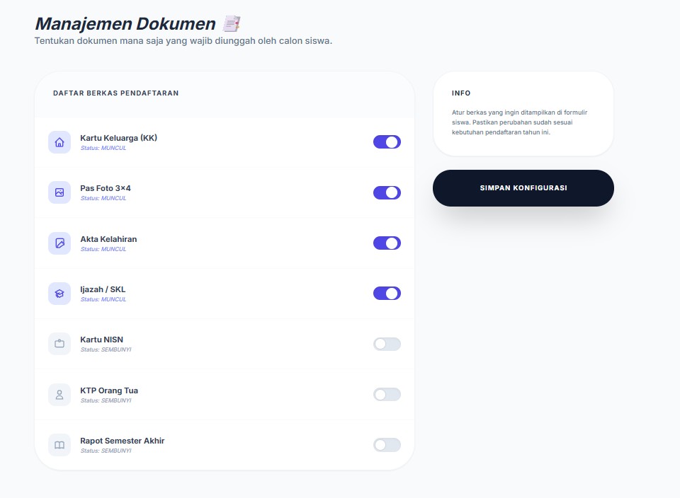 Flexible Form Builder: Butuh data NIK, KIP, atau hobi? Tambahkan kolom biodata tambahan sesuai kebutuhan sekolah Anda melalui panel admin.